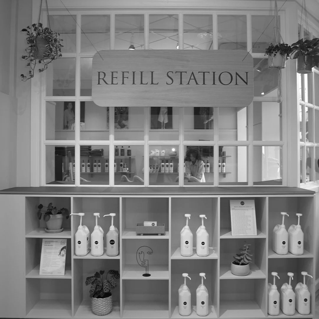 I vores saloner kan du nemt genopfylde dine tomme produkter på vores refill-stationer – en simpel måde at reducere plastikforbruget og skåne miljøet.